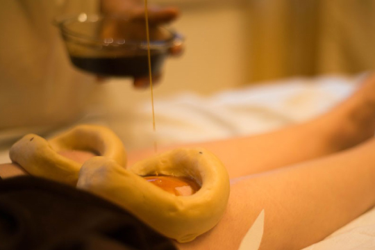 Kati Vasti is a traditional treatment.Specially prepared warm herbal oil is poured over the lower back (lumbar region) and retained inside a well sculpted circular ridge made from black gram paste for the required duration. It is very effective in treating lower back pain, sciatica and spinal problems.